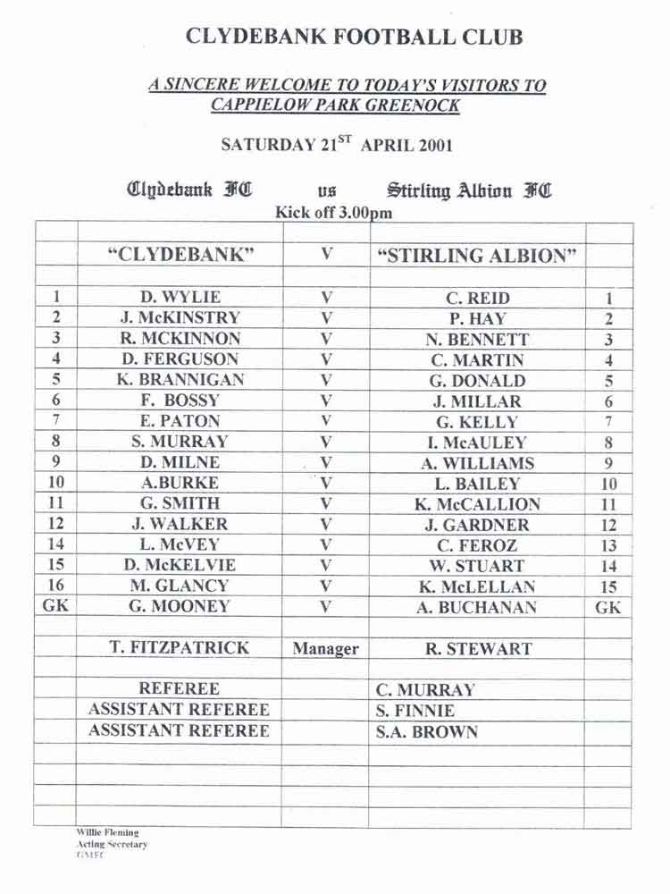 | 21/04/2001 | League (Division 2) | League | (H) | (H) | 1 - 1 |